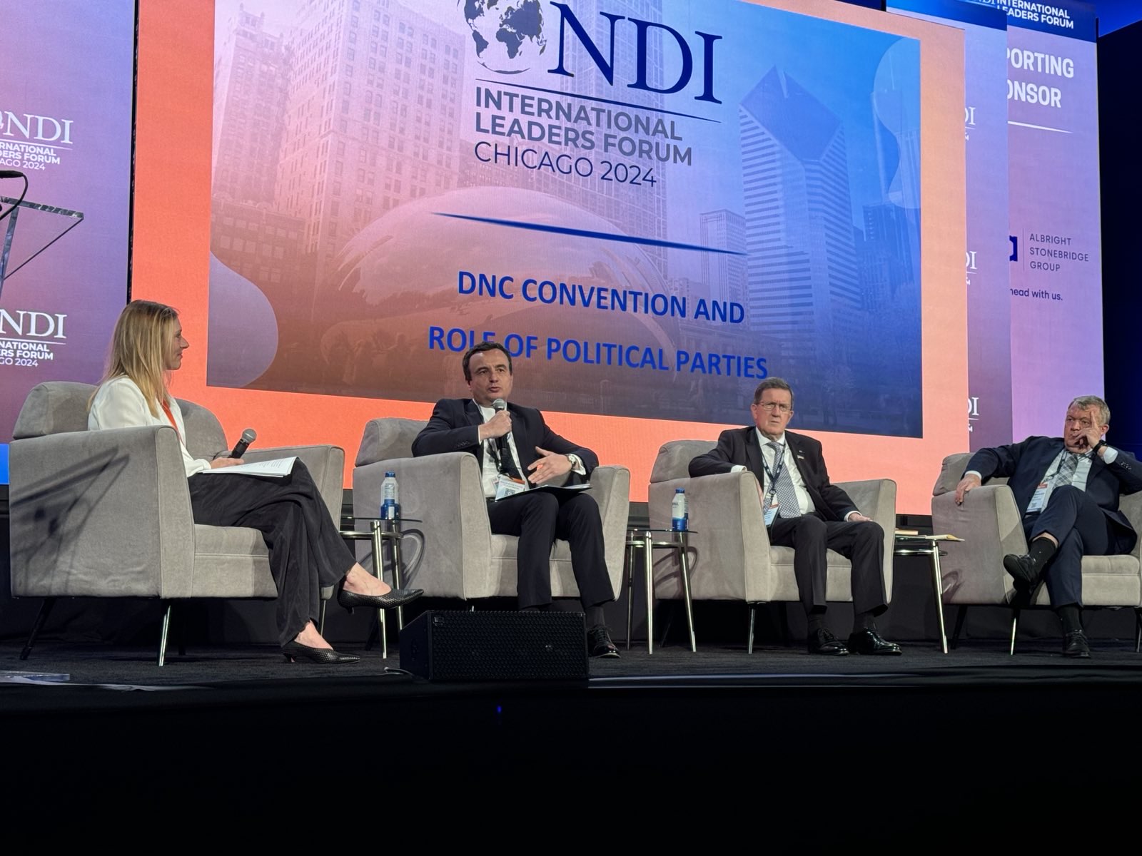 The Prime Minister of the Republic of Kosovo, Albin Kurti, participated in the discussion panel entitled “National Democratic Convention and the Role of Political Parties”. The event was held in Chicago, where the National Democratic Convention is taking place, and was organized by NDI, as part of of the International Leaders Forum 2024.
