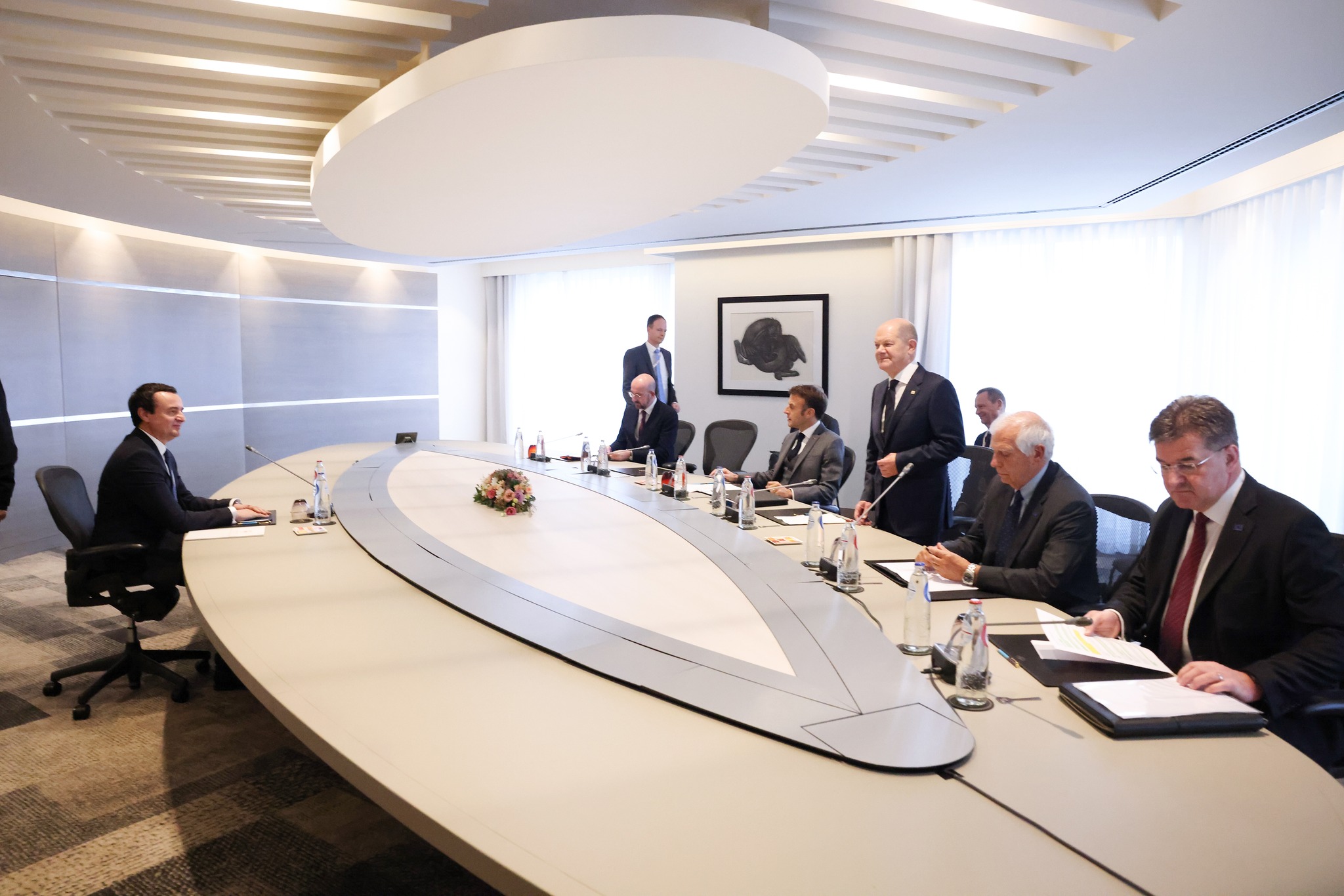 Në takimin e sotëm, me Kancelarin e Gjermanisë, Olaf Scholz, me Presidentin e Francës, Emmanuel Macron, Kryeministren e Italisë, Giorgia Meloni, Presidentin e Këshillit Evropian, Charles Michel, zëvendës Presidentin e Komisionit Evropian dhe Përfaqësuesin e Lartë për Politikë të Jashtme dhe të Sigurisë, Josep Borrell, si dhe emisarin e tij, Miroslav Lajcak, Kryeministri Kurti i falënderoi të gjithë ata për rolin, angazhimin dhe kontributin për paqe dhe normalizim të marrëdhënieve ndërmjet Republikës së Kosovës dhe Serbisë.