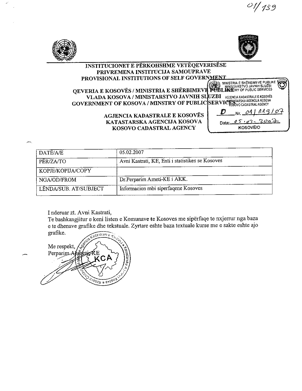 “të bashkangjitur e keni listën e Komunave të Kosovës me sipërfaqe të nxjerrur nga baza e të dhënave grafike dhe tekstuale. Zyrtare është baza tekstuale kurse më e saktë është ajo grafike”. Kjo shkresë është protokolluar me nr. 01/119/07 të datës 05.02.2007.