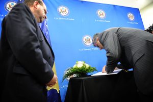 Kryeministri i Qeverisë së Republikës së Kosovës, Hashim Thaçi sot është nënshkruar në librin e ngushëllimeve në Ambasadën e Shteteve të Bashkuara të Amerikës në Prishtinë, me rastin e vrasjes së dy ushtarëve amerikanë në Gjermani.