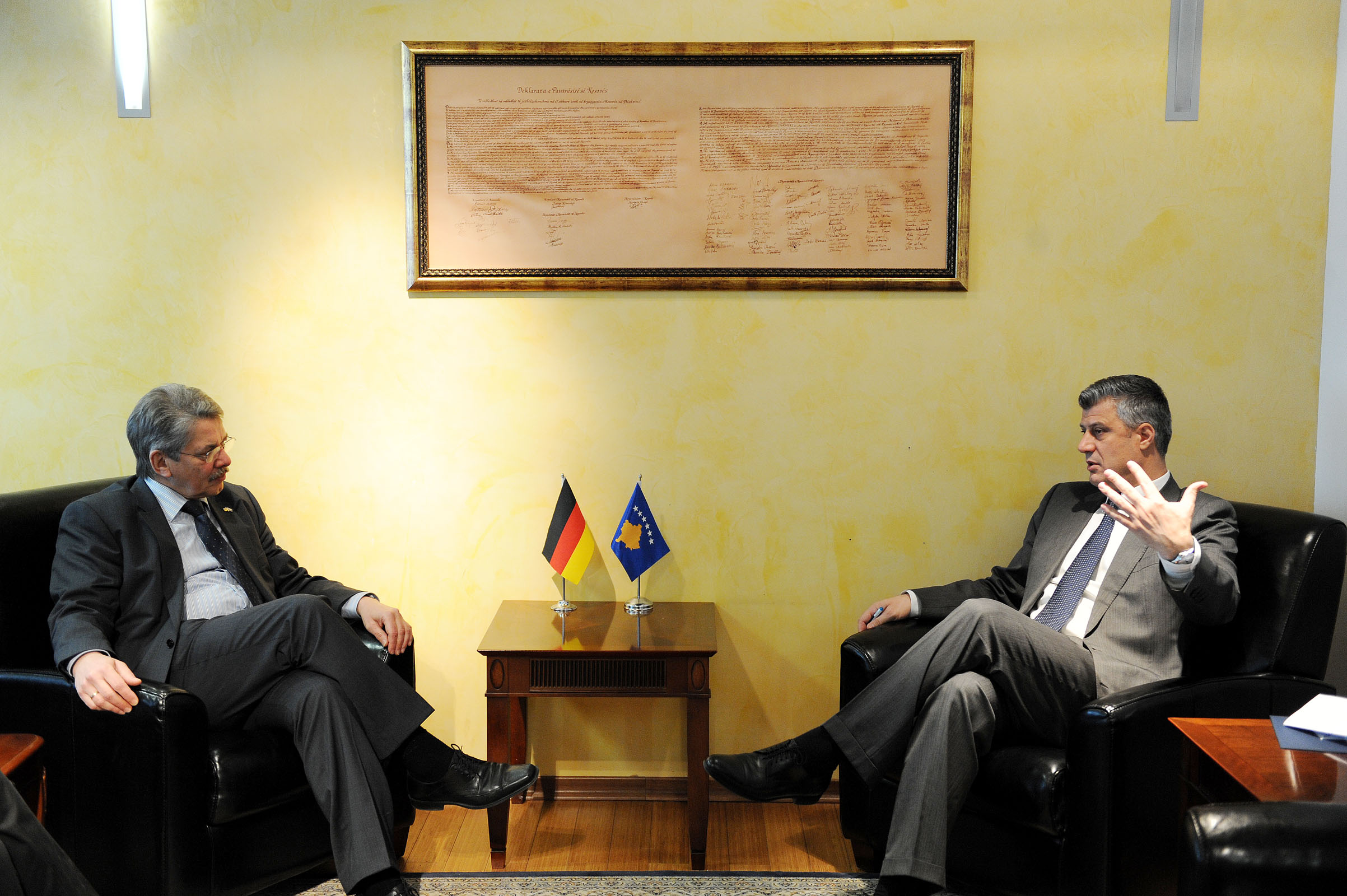 Nga ana e tij, kryeministri i Republikës së Kosovës, Hashim Thaçi falënderoi amabasadorin Hans Dieter Steinbach, amabasadorin Alan Van Gucht dhe ambasadorin Jean François Fitou për mbështetjen e vazhdueshme të Gjermanisë, Belgjikës dhe Francës për Republikën e Kosovës në procesin e lirisë, pavarësisë, demokratizimit dhe zhvillimit të Kosovës.