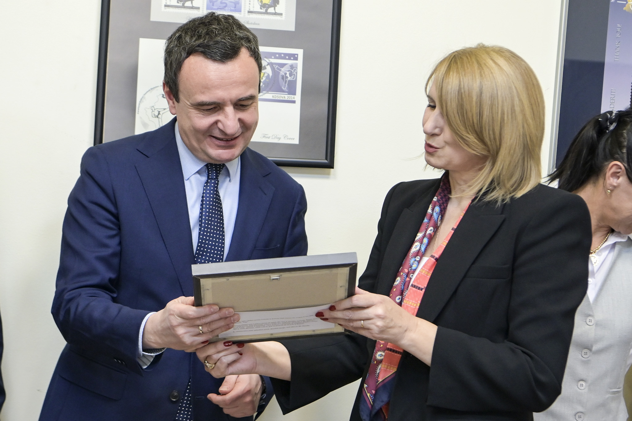 Në shenjë mirënjohje dhe vlerësimi për mbështetjen e tyre për Postën e Kosovës, në përfundim të vizitën, kryeshefja Ekzekutive, Nora Rraci u dhuroi kryeministrit Kurti dhe ministres Rizvanolli pulla postare të kornizuara.