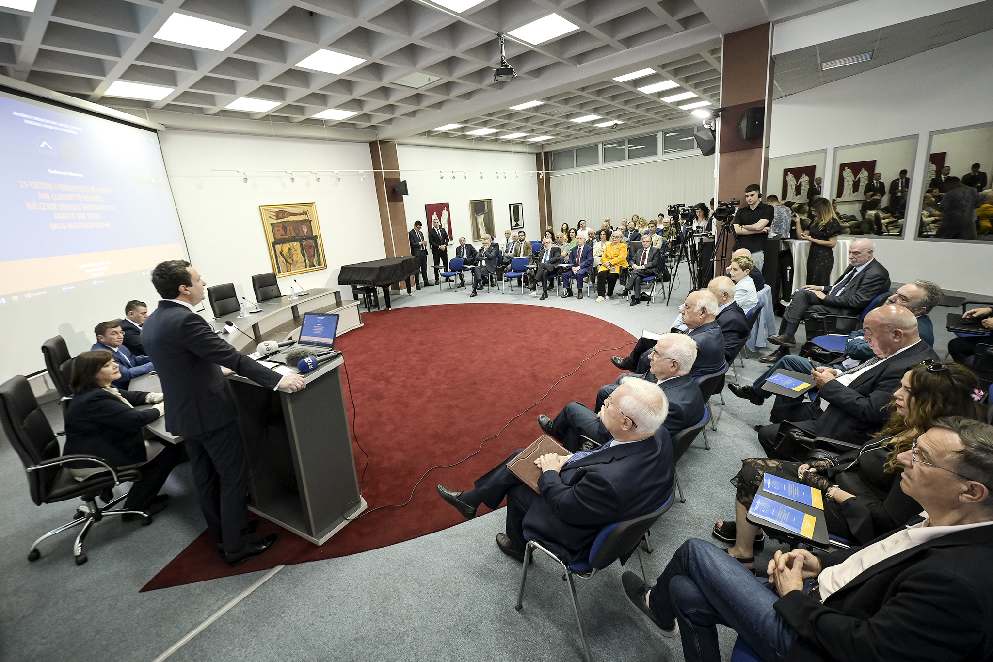 “Më vjen mirë që javën gjatë të cilës do ta shënojmë 25-vjetorin e çlirimit të Kosovës, po e nisim pikërisht me një konferencë shkencore dhe pikërisht këtu në Akademinë e Shkencave dhe Arteve të Kosovës. Sepse historia dhe trashëgimia e luftës në Kosovë, kanë aq shumë nevojë për t’u studiuar, hulumtuar dhe për t’u shkencëruar. Ngase ne si shoqëri dhe si shtet, kemi nevojë për diskurse të mirëfillta shkencore dhe për narracione sa më të plota dhe të vërteta historike për luftën tonë”, e filloi kryeministri Kurti fjalën e tij hyrës para të pranishmëve në këtë konferencë.