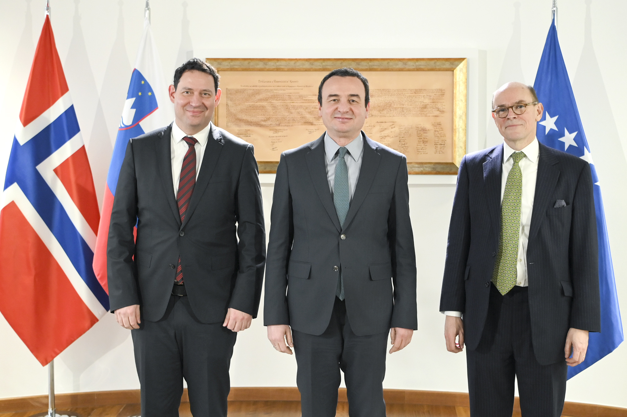 Duke i uruar mirëseardhje, kryeministri Kurti shprehu falënderimin e tij për kontributin e Norvegjisë dhe Sllovenisë në avancimin e shtetit të Kosovës. Ai çmoi angazhimin dhe kontributin e këtyre dy vendeve mike të Kosovës dhe të dërguarve të tyre në dialogun për normalizimin e marrëdhënieve ndërmjet Kosovës dhe Serbisë.