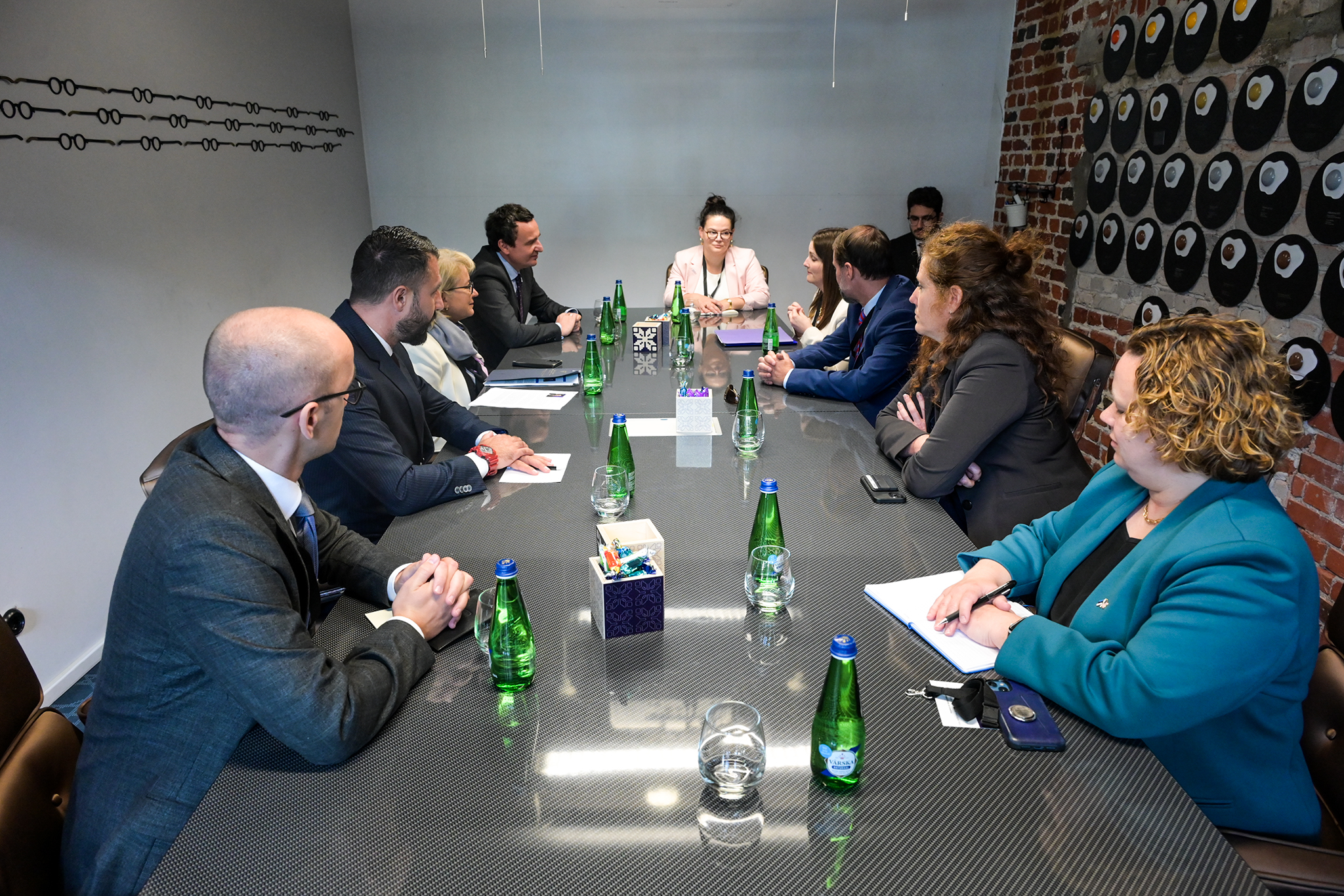 Edhe në këtë takim, ai ishte i shoqëruar nga ambasadorja e Kosovës për Estoni, Shkëndije Geci Sherifi, ministri i Administrimit të Pushtetit Lokal, Elbert Krasniqi dhe zëvendësministri i Punëve të Jashtme dhe Diasporës, Kreshnik Ahmeti. Ndërkaq, përkrah zëvendës ndihmës Sekretares në detyrë të Departamentit të Shtetit amerikan, Peters, ishte edhe Zëvendës ndihmës Sekretarja kryesore në Byronë për Hapësirë Kibernetike dhe Politika Digjitale të Departamentit të Shtetit, njëherësh ish- zëvendës ambasadorja e Amerikës në Kosovë, Jennifer Bachus.