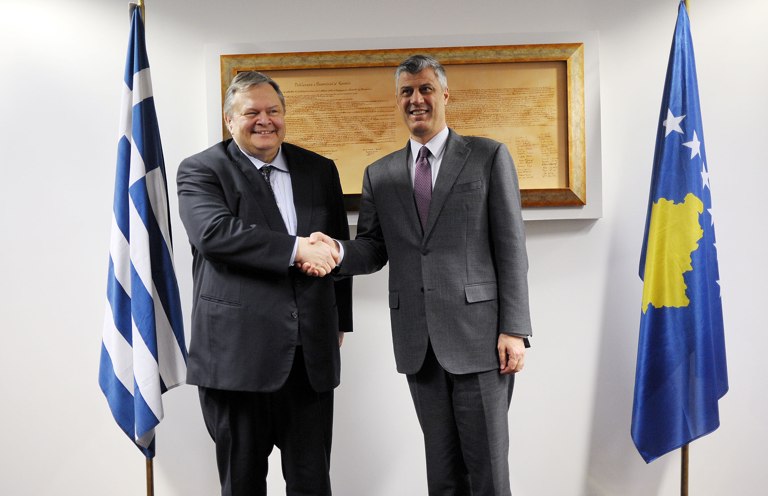 Zëvendëskryeministri dhe ministri i punëve të jashtme të Greqisë, Evangelos Venizelos fillimisht e falënderoi kryeministrin Thaçi për pritjen dhe për referencën miqësore të marrëdhënieve bilaterale mes Kosovës dhe Greqisë.