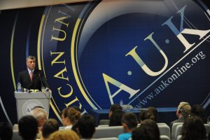 Kryeministri i Qeverisë së Republikës së Kosovës, Hashim Thaçi, ka mbajtur sot një ligjëratë para studentëve dhe profesorëve të Universitetit Amerikan të Kosovës. Në vazhdim po e japim të plot ligjëratën e kryeministri Thaçi.