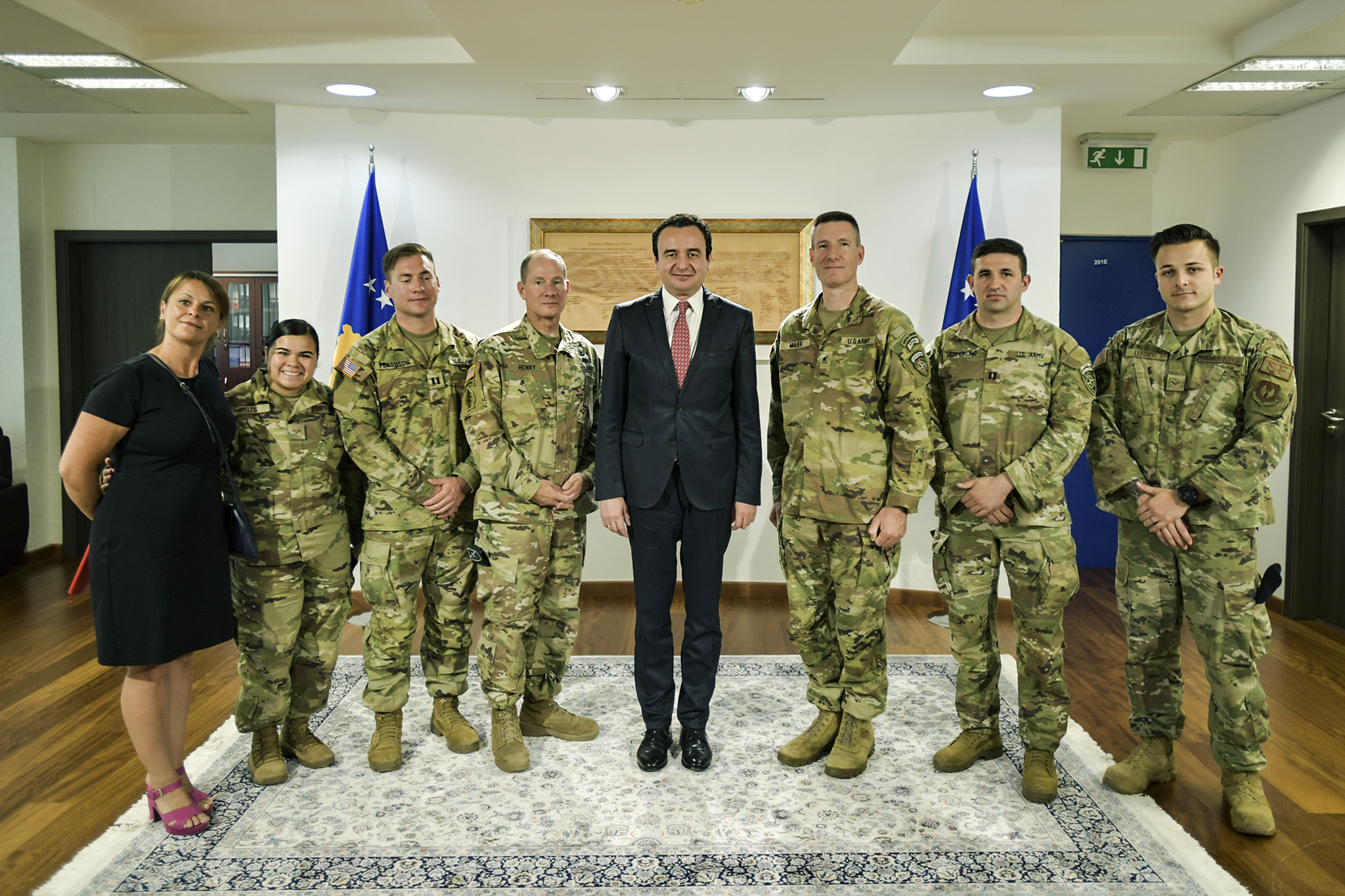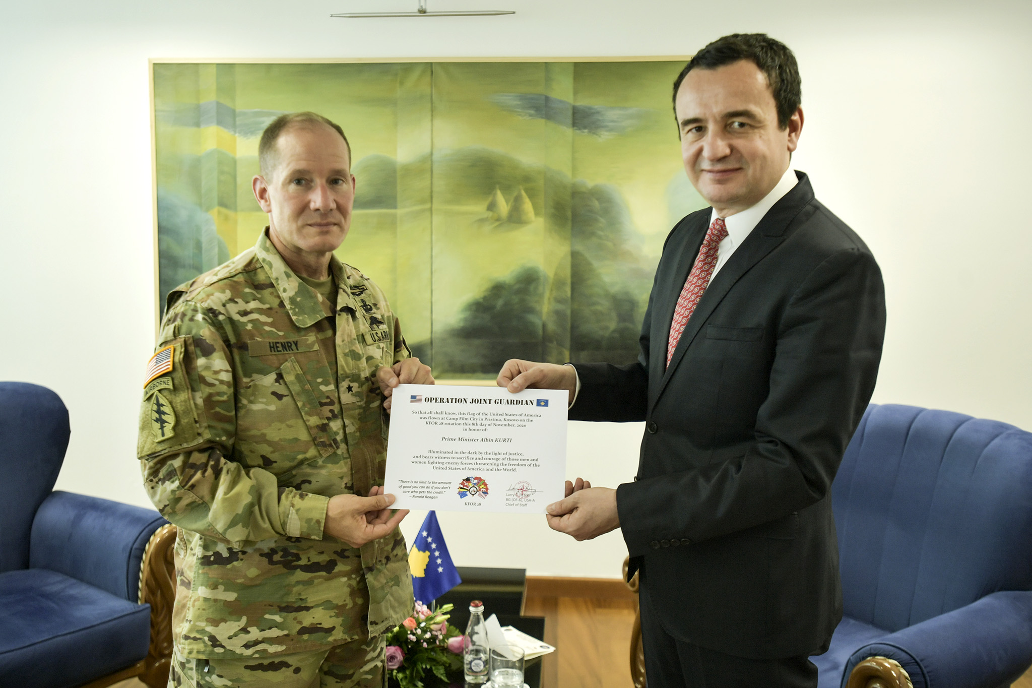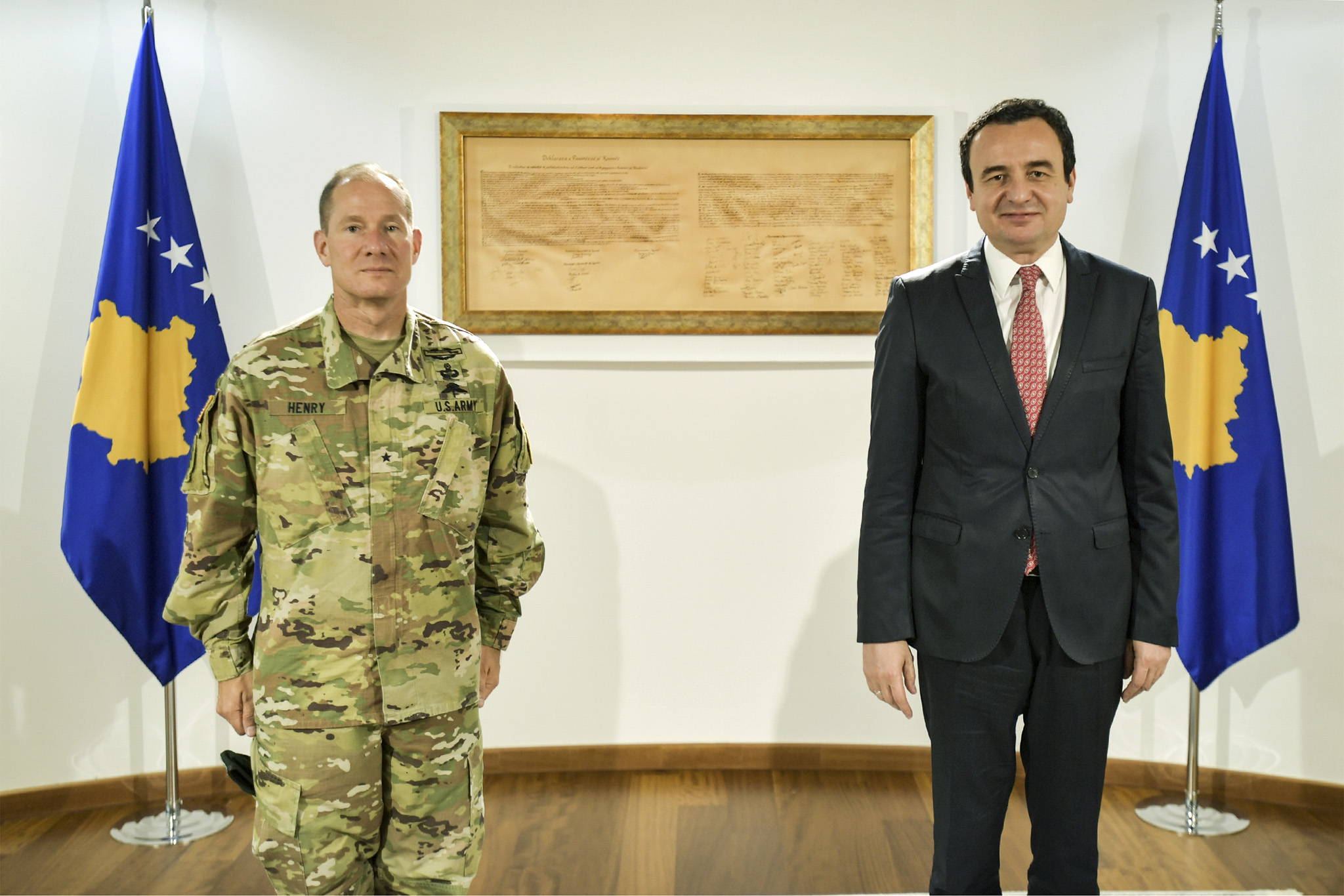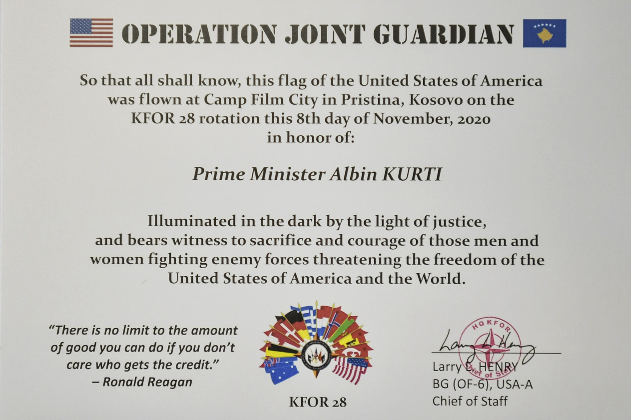 Gjeneral Brigadieri Henry i dorëzoi Kryeministrit flamurin e Shteteve të Bashkuara të Amerikës, i cili është ngritur më 8 nëntor, në nderim të Kryeministrit të Republikës së Kosovës, Albin Kurti, në Njësitin mbështetës të ShBA-së, në Film City në Prishtinë. Flamuri shoqërohet me përshkrimin: “Ndriçuar në errësirë nga drita e drejtësisë, ky flamur dëshmon sakrificën dhe guximin e atyre burrave dhe grave në luftë me forcat armike që kërcënojnë lirinë e Shteteve të Bashkuara të Amerikës dhe botës”.
