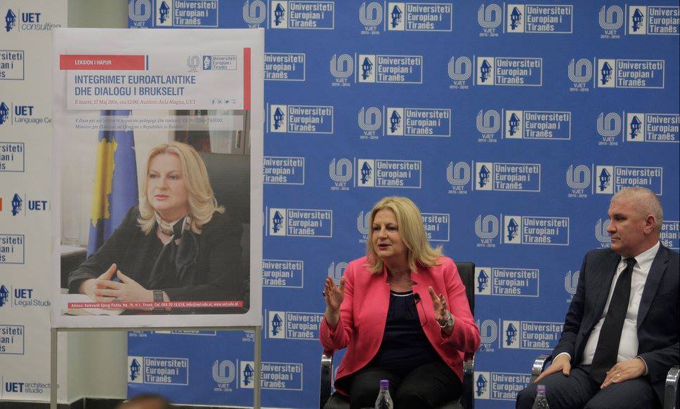 During the visit to Albania, the Minister for Dialogue, Edita Tahiri, at the invitation of the European University of Tirana (UET) yesterday gave a lecture to students and professors of the university on the topic “Euro-Atlantic Integration and Dialogue of Brussels”.